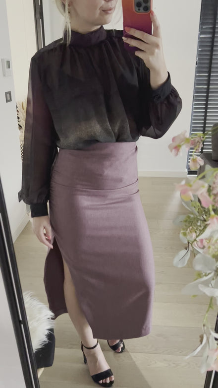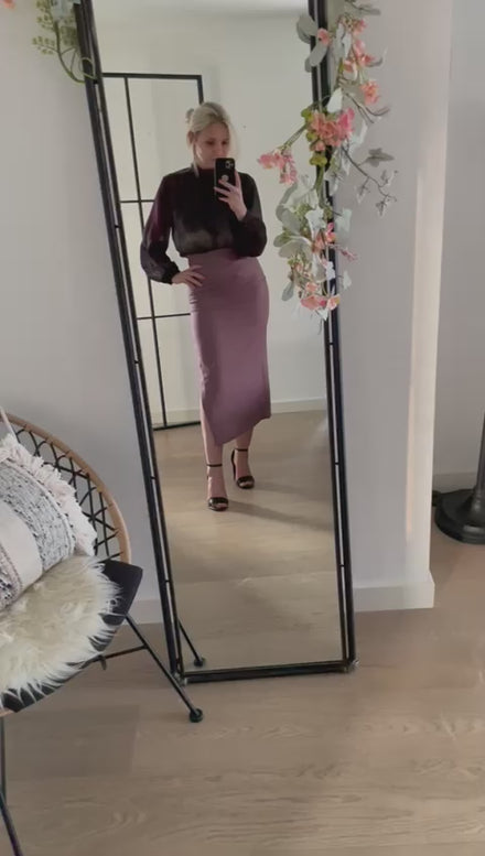Getailleerde rok met zijsplit. Ritssluiting aan de zijkant. Normale pasvorm.