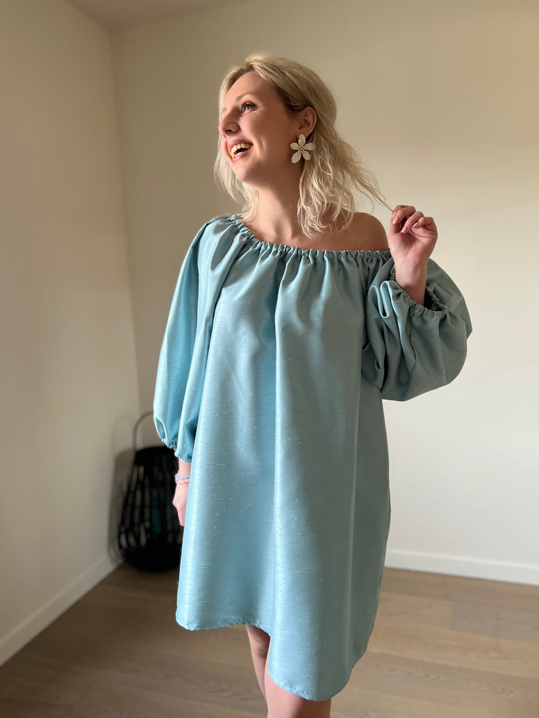Oversized jurk met rekker aan de mouwen en hals/schouders afhankelijk hoe je het draagt. Inclusief bijhorend lintje. Kan je ook als een losse jurk dragen.