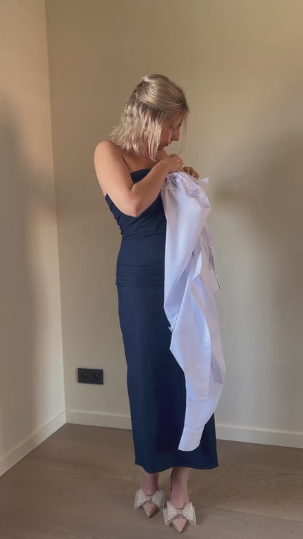 Een donker denimblauwe jurk in een nauwe pasvorm met maxi-lengte en een split aan de achterkant. Vouw aan de bovenkant en een verborgen rits aan de zijkant.