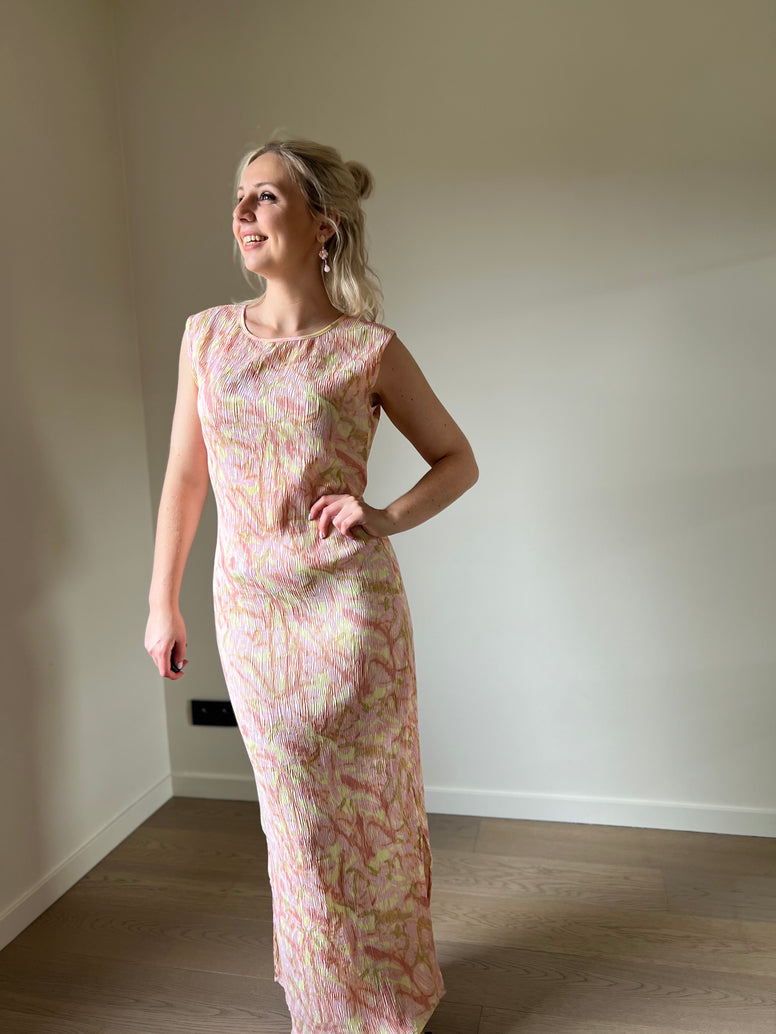 Emelie Pleated Dress - een dromerige maxi-jurk versierd met een roze en gele print. Deze jurk heeft een ronde hals en brede banden, die stijl en comfort combineren voor een echt betoverende look.