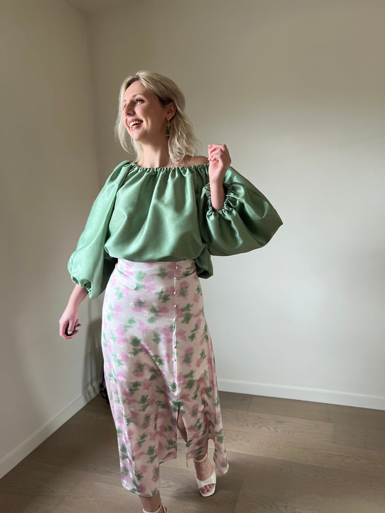 Rok met onderrokje en knopen met split aan de zijkant. Rits aan de achterkant.
