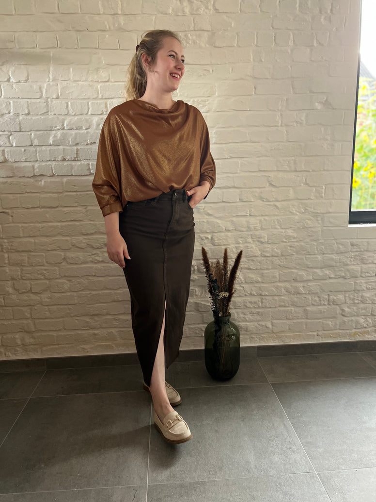 Blouse met zachte hals en ellebooglange mouwen.Gemaakt van gelamineerde stof. Soft fit, 1 maatje geschikt tot maat 44.
