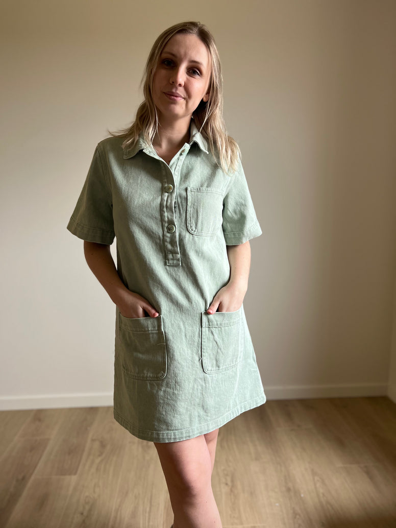 Frisse mintgroene jeansjurk gemaakt van 100% katoen. Een verfrissende kleur die perfect is voor de lente en zomer. Comfortabel en stijlvol tegelijk.